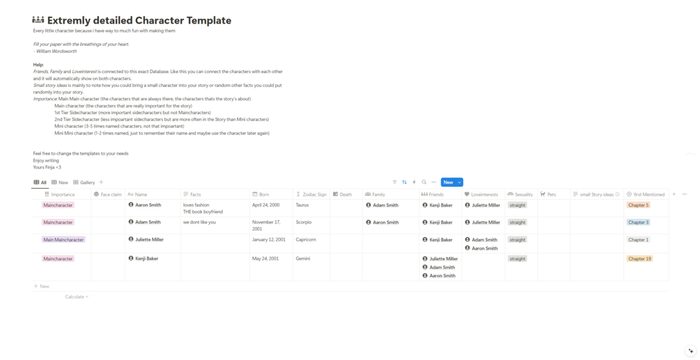 Detailed Notion Character Template for Writers