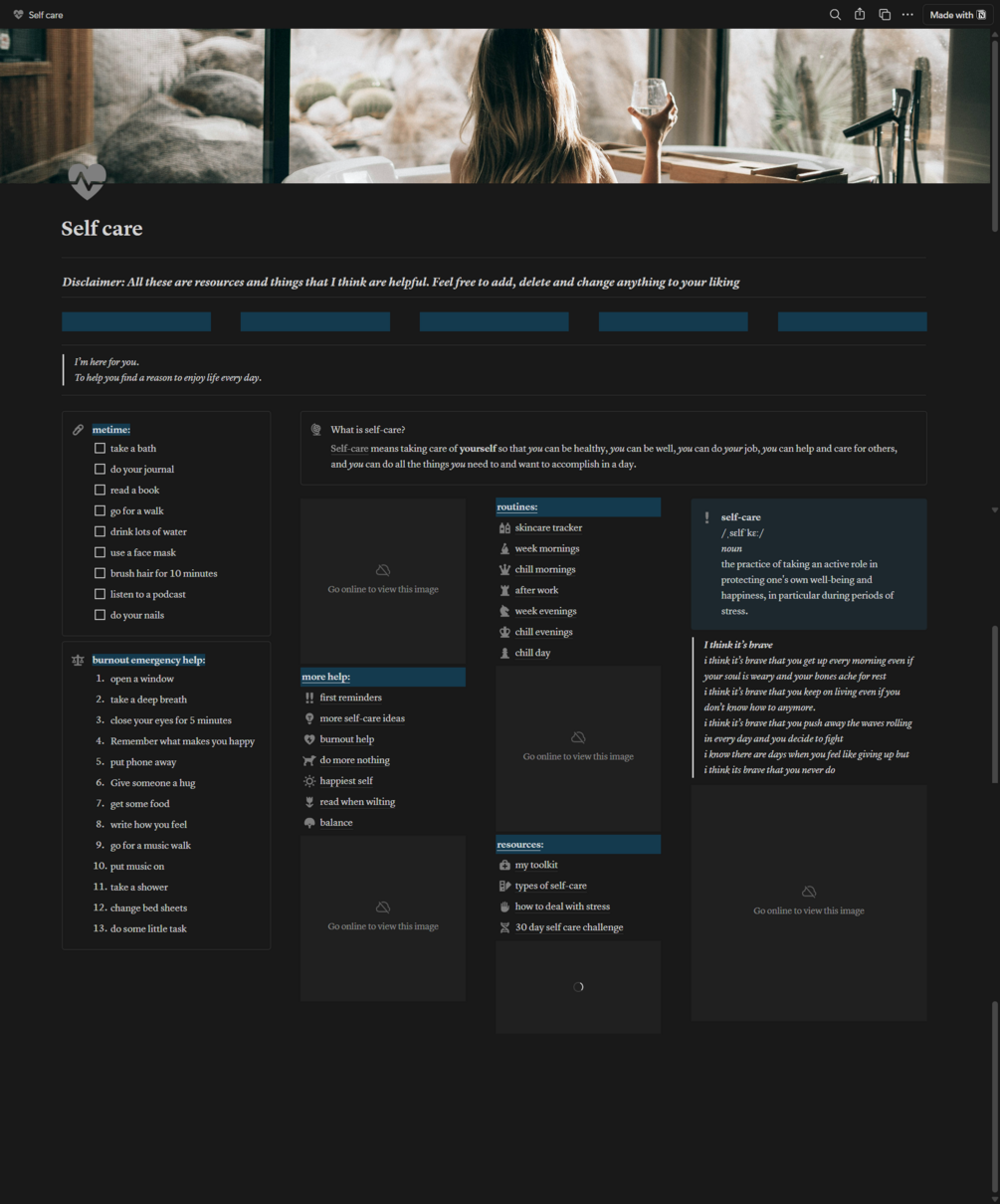 A soothing template with self-care routines and a comforting collection of emergency tips for bad days. It’s your gentle, organized space to breathe, reset, and take care of yourself.